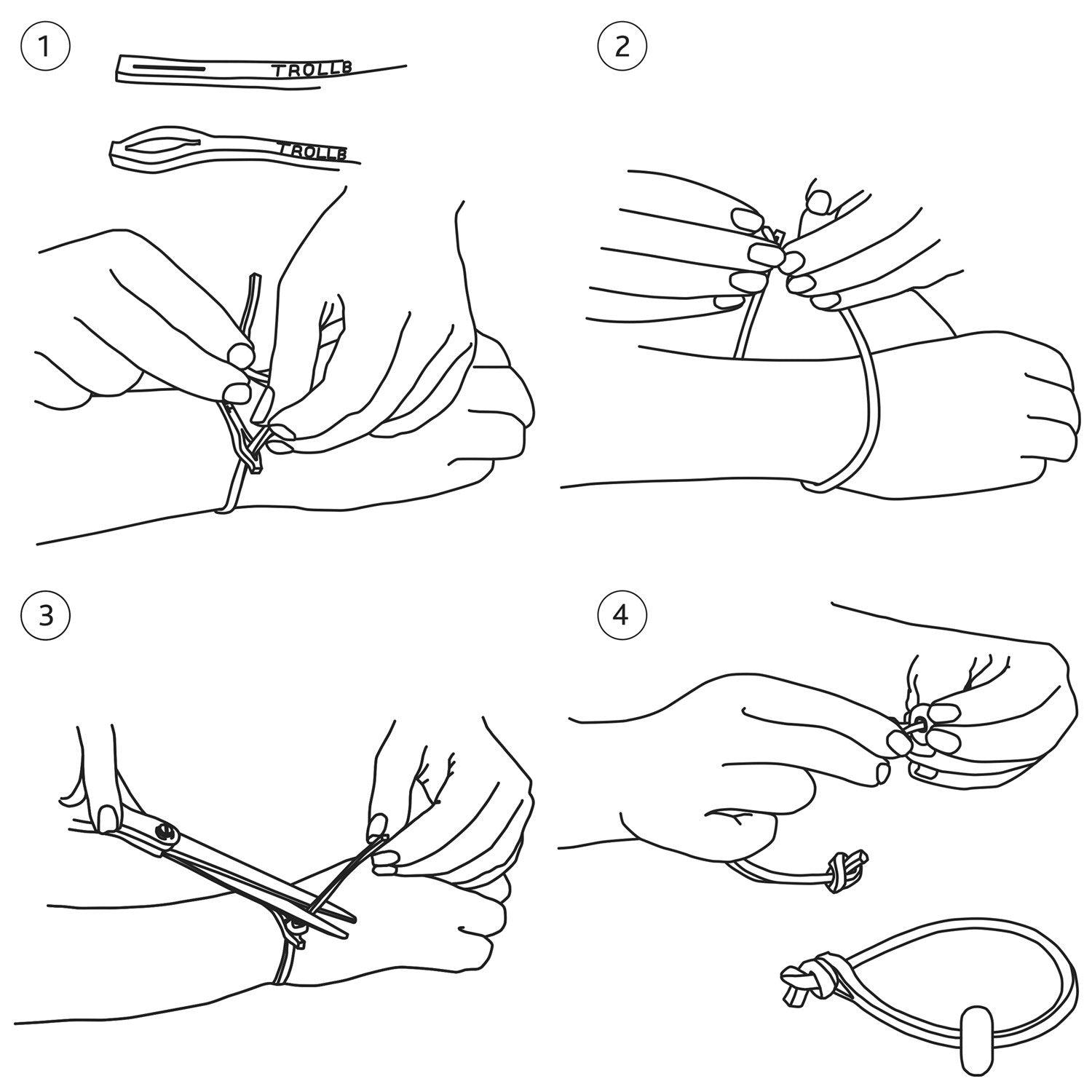 Az egyszerű bőr karkötőhöz nincs szükség csattra, elegendő egy csomót kötni rá. A csomó helye határozza meg a karkötő hosszát. A karkötőt úgy zárhatja be, hogy a csomót átfűzi a hurokon az ellenkező végén.